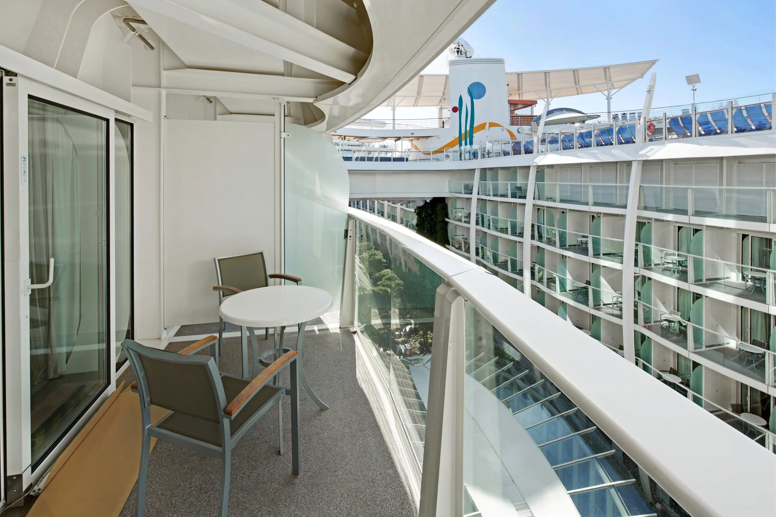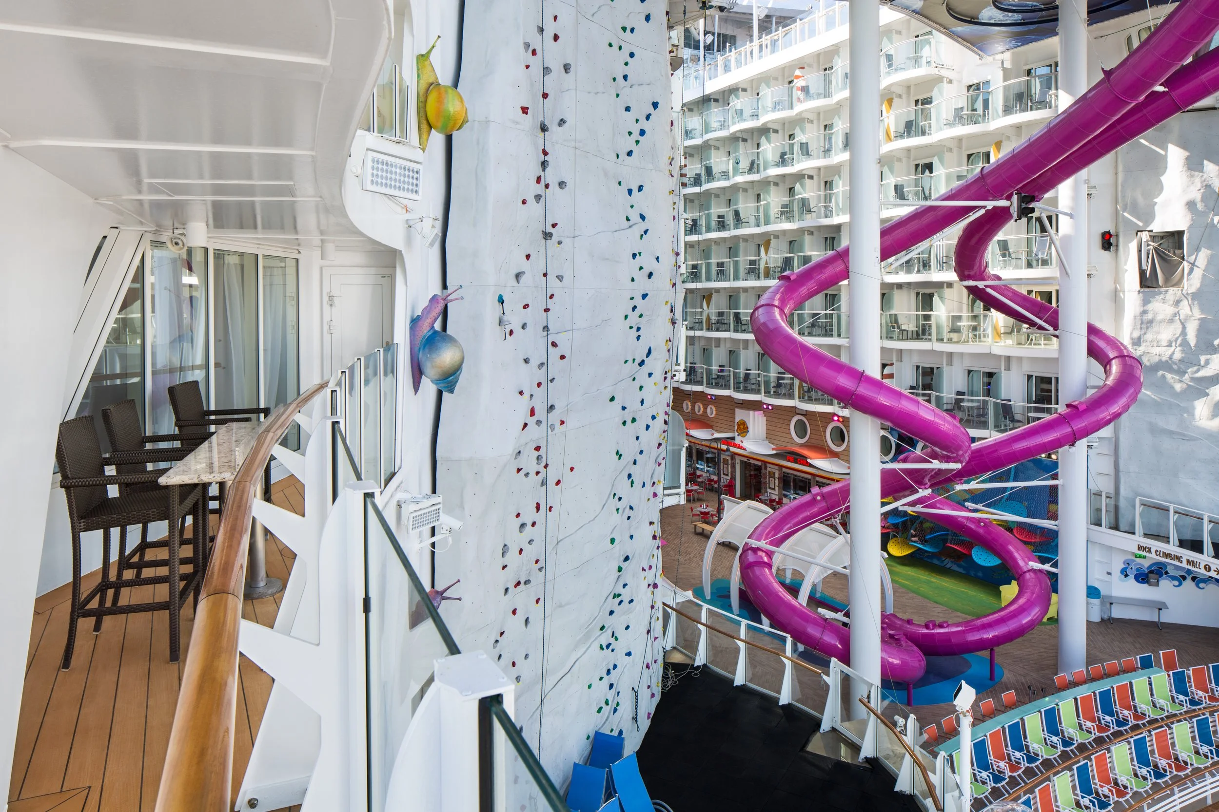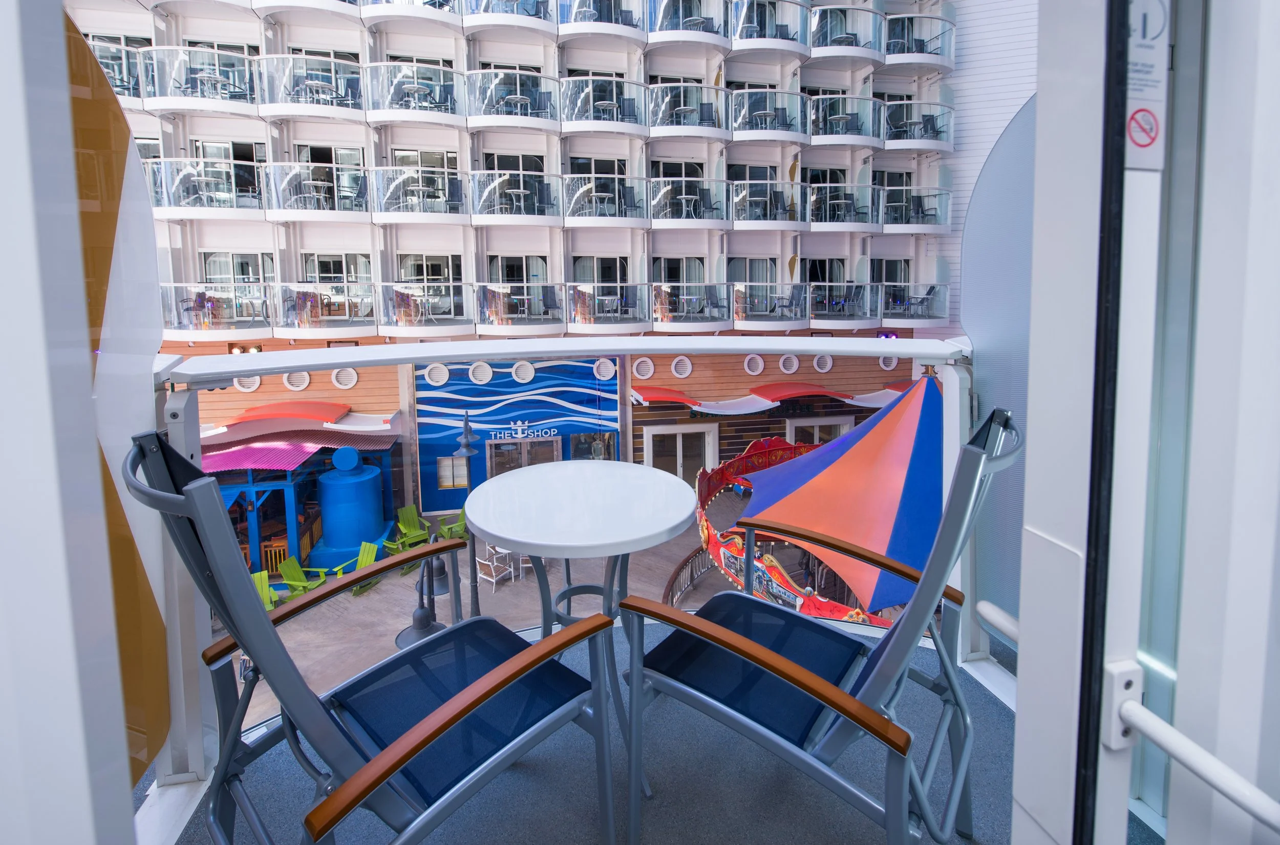 When you think “balcony cabin,” you probably picture blue ocean views and sea breezes. But on Royal Caribbean’s biggest ships, you can book something totally different — interior-facing balcony cabins that overlook lively neighborhoods like Central Park, Boardwalk, and now Surfside on the brand-new Icon Class ships.