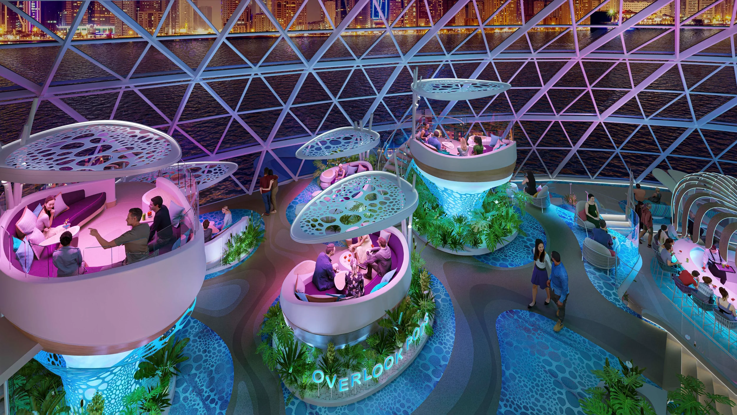 What to expect: A double-purpose performance and lounge zone. In one mode, it’s daytime light-filled seating and perch spots. In another, it’s an amphitheater for aerial and aquatic shows (think dramatic water + performance).